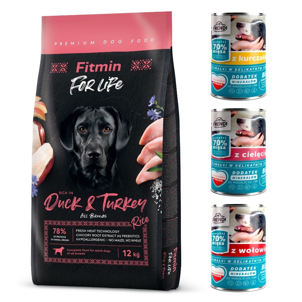 Fitmin For Life Duck and Rice kaczka z indykiem 12 kg + 3 puszki karmy Frendi