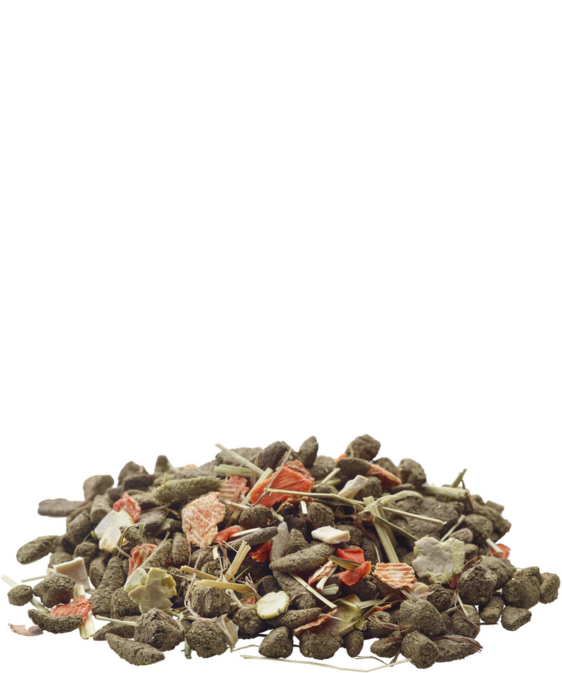 Skład: produkty pochodzenia roślinnego (tymotka, trawy i zioła 23%), warzywa (groch zielony 12,5%, marchew 6,3%, pasternak 2,6%), owoce, nasiona, minerały, roślinne ekstrakty białkowe, oleje i tłuszcze, FOS, nagietek, MOS, algi, jukka